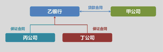 甲公司从乙银行贷款5000万元。丙公司、丁公司与乙银行签订保证合同,为甲公司提供连带保证。具体如下图: