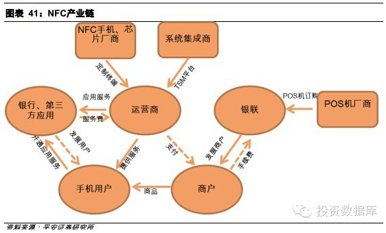 支付平台的建设由系统集成商完成,支付产品的研发由应用开发商完成。此外,支付平台的建设和支付产品的研发,涉及到各种软硬件解决方案,这不是单纯的银联和电信运营商能满足的,因而就需要大量的支付系统相关应用开发商和系统集成商提供支持(比如新开普、天喻信息等)。综上,NFC产业链的构成包括移动运营商、银行、终端设备制造商、应用开发商、系统集成商、商户以及移动终端用户。