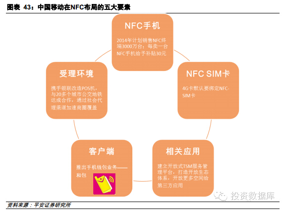运营商主要负责发展手机钱包用户,定制销售NFC手机及芯片。以中移动为首的运营商对NFC业务的包括NFC手机、NFC-SIM卡、相关应用、客户端、受理环境五大要素进行了布局。