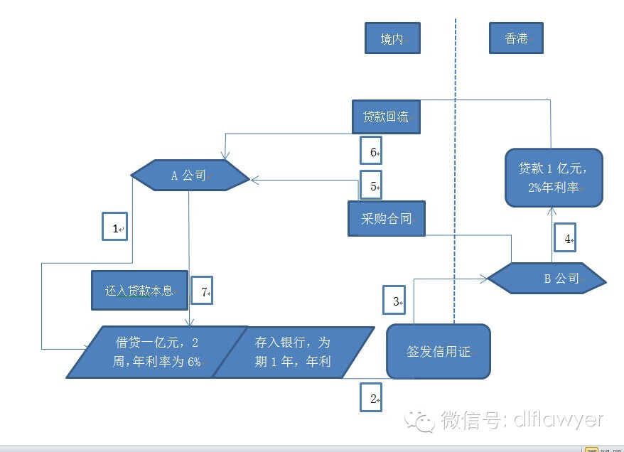 这是最复杂的模式,需要在在岸人民币与离岸美元,以及在岸人民币/美元和离岸人民币/美元之间进行。如在内地贷款1亿元人民币、利率6%,期限2周,把1亿元以1年定期存款存入银行,利率3%,银行签发信用证。