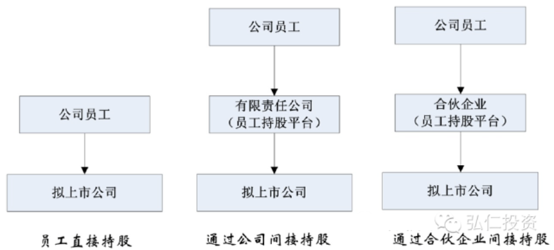 拟上市公司通常采用员工持股的方式,增强员工对企业的归属感和企业凝聚力,吸引和留住人才。员工持股方式主要有员工直接持股、通过公司间接持股、通过合伙企业间接持股三种,示意图如下:
