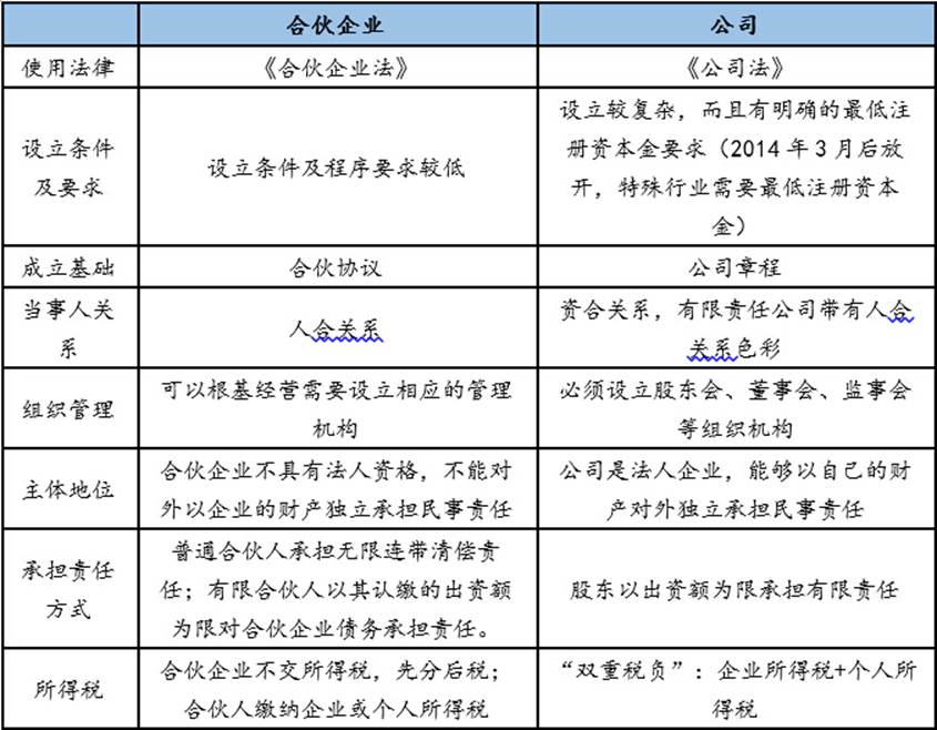 公司也是员工持股平台常见的形式,合伙企业与公司的区别如下: