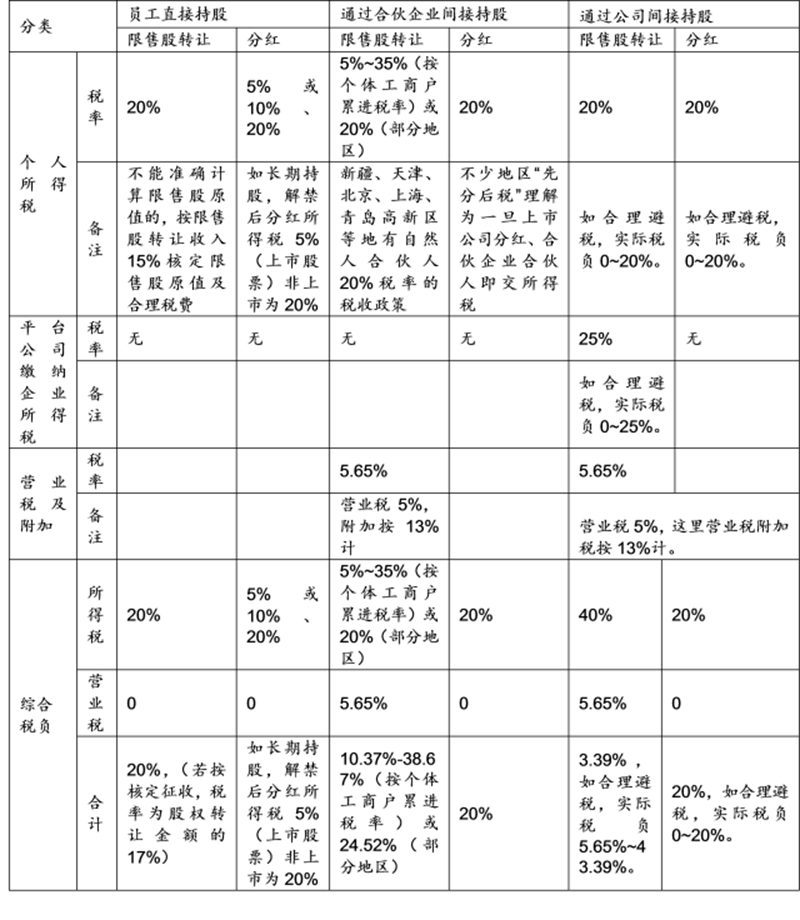 (2)相比公司制企业,在税收方面有优势,在转让限售股时,营业税及附加税为5.65%,员工缴纳5%~35%(按个体工商户税率缴纳)或20%的所得税(根据不同地区政策而定),加上营业税及附加,合计税负为10.37%~38.67%(按个体工商户税率)或24.52%(部分地区)。但如果税收筹划合理,通过公司持股方式的实际税负可能低于合伙企业,且在实际操作中,公司的纳税时间一般延后,而合伙企业的纳税时间较早。