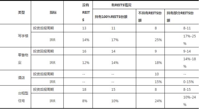 通过测算可以发现,在有REITS的情况下,商业地产企业通过将其所持有的商业物业(无论是写字楼、零售物业、出租型物业还是酒店)出售给REITS实现退市套现、回笼资金,进而提高了IRR和缩短了投资回报周期,而这也是REITS对商业地产企业最大的影响。