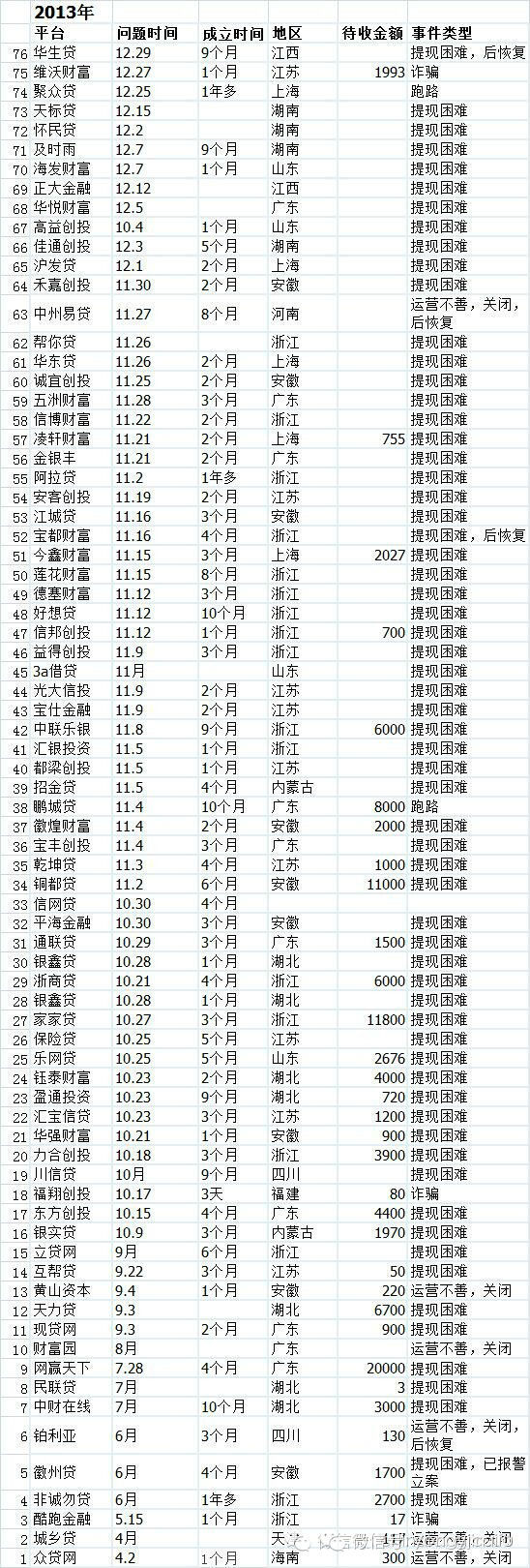 从统计资料中,我们不难发现,网贷平台出事时间集中,13年下半年的10、11月接二连三爆发,有时候,一天甚至好几个雷,那时候,投资者整天提心吊胆,唯恐自己投资的平台出事,要是一天没有一起平台出现问题,还觉得不安心,认为会有更大的暴风雨来临。
