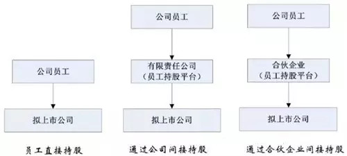 拟上市公司通常采用员工持股的方式,增强员工对企业的归属感和企业凝聚力,吸引和留住人才。员工持股方式主要有员工直接持股、通过公司间接持股、通过合伙企业间接持股三种,示意图如下: