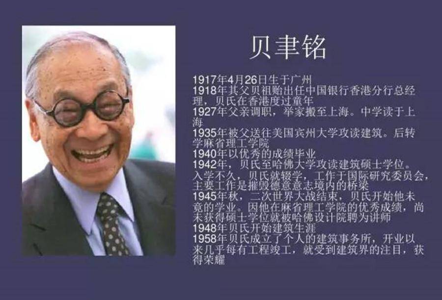 贝聿铭的父亲是贝祖贻,贝祖贻有一项响亮的成就,那就是创立了中国银行。优越的家庭条件给贝聿铭提供了非常好的学习环境,而父亲广阔的人脉,又在无形中给了贝聿铭诸多支持。